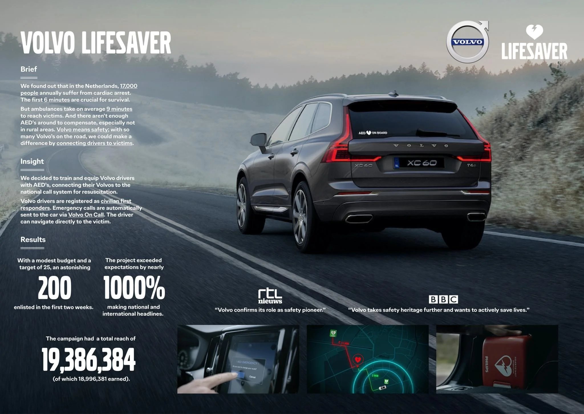 Volvo is all about safety, but why should we only prevent deaths if we can also save lives? We equipped Volvos with an AED and connected them to the 112 emergency call system. When a cardiac arrest is reported to 112, a nearby Volvo equipped with a Lifesaver immediately receives a notification and is automatically navigated to the location to bring the AED and start resuscitation.
